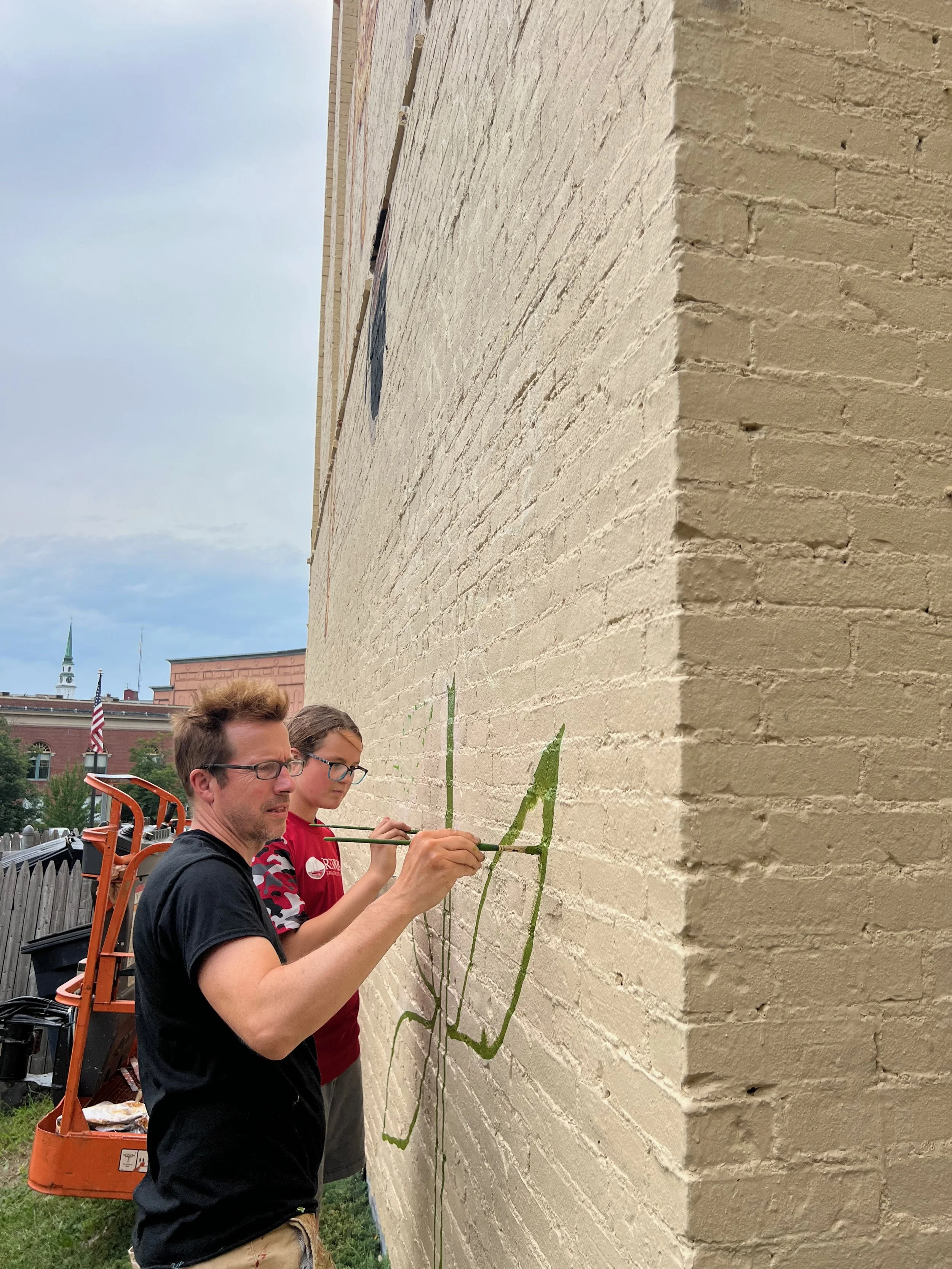 Annette Dodd, one of the founders of Bangor Beautiful bangorbeautiful.org in Bangor, Maine, had worked on a project with an old friend of mine from art school (Pete Walls). It was a conversation between them that led Annette to reach out to me. It only took about a year and I found myself heading up to Maine. I grew up in New England, mostly in Massachusetts, but my grandparents and cousins were in NH and we would ski in Vermont and go up to Ogunquit Maine and the beaches in the summer. Despite having lived in New York (the city and upstate) for over 20 years at this point, everything about New England still feels like home to me. I have tried many times throughout the years to land in a northern state during the hottest months of the year and I finally did it in July of 2023 with this mural. I was ready for warm days and sweatshirts in the evening. But it is Maine, so it didn’t cooperate. I was sweltering on a southern exposure wall until about 3:30pm as if I was in North Carolina and the heat never seemed to let up. I had to have the lift maxed out to reach the highest point and suddenly (and without warning) the wind would gust causing the lift to sway unexpectedly. I have zero fear of heights, literally zero. But this freaked me out more than a few times!